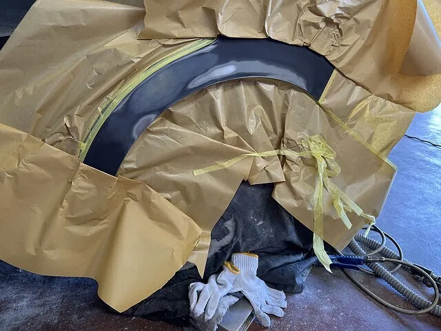 クオーターパネルはサフェーサーを塗布→ペーパーで研いで面を整える、という作業を数回行い変形が分からないように修理していきます。